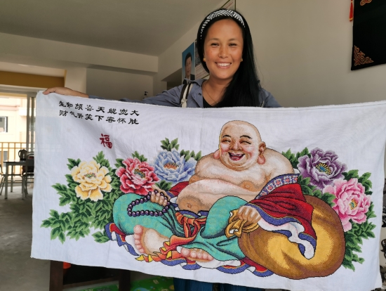 其实,和大多数彝族妇女一样,勒格吉克莫从小就和长辈们学习彝绣,但从未接受过正规的教学,主要靠自己琢磨。“虽然以前我也能绣出一些衣服、饰品,但只能自家人穿戴,不能作为商品卖成钱。”在沐恩邸社区的新家里,她向记者展示了她曾经制作的一幅名为《福》的彝绣作品,画面栩栩如生。