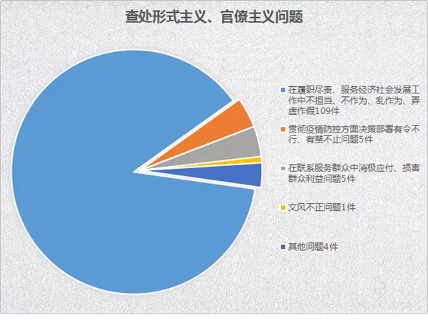 从查处形式主义、官僚主义问题看,查处形式主义、官僚主义问题124件178人,给予党纪政务处分74人。及时发现和严肃查处疫情防控工作中存在的形式主义、官僚主义问题34件53人。