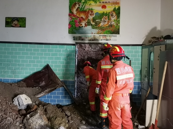 1时48分,救援人员到达到现场,经侦查和询问发现:事故现场为农村自建房,房子侧面紧靠山体,因近日强降雨导致山体垮塌冲击民房。