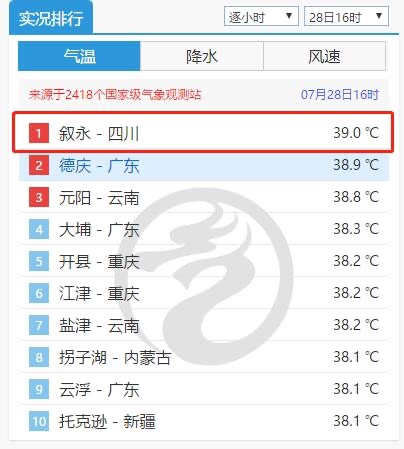 7月28日16时,泸州市叙永县以39℃登上全国气温第一的“宝座”。在今早10时12分,泸州市气象台便发了布高温短时临近天气预报,预计今天午后泸州市最高气温将上升到35℃以上,部分地方最高气温将超过38℃。
