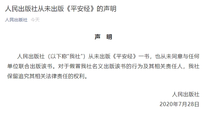 7月28日下午,人民出版社发表声明,称从未出版《平安经》一书。此前,有网友晒出图书《平安经》引发热议。该书内容均为“XX平安”造句,从“眼平安,耳平安,鼻平安,舌平安,身平安,意平安”,到“西安火车站北站平安、郑州火车站东站平安、上海虹桥火车站平安” ,将世界地名、行业名称等一一例举。