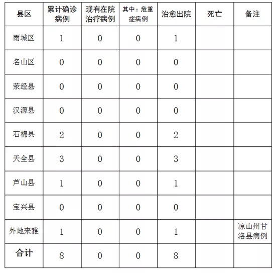截至7月28日24时,雅安市累计确诊新冠肺炎病例8例,累计治愈出院8例;累计报告无症状感染者3例,已解除集中医学观察3例。