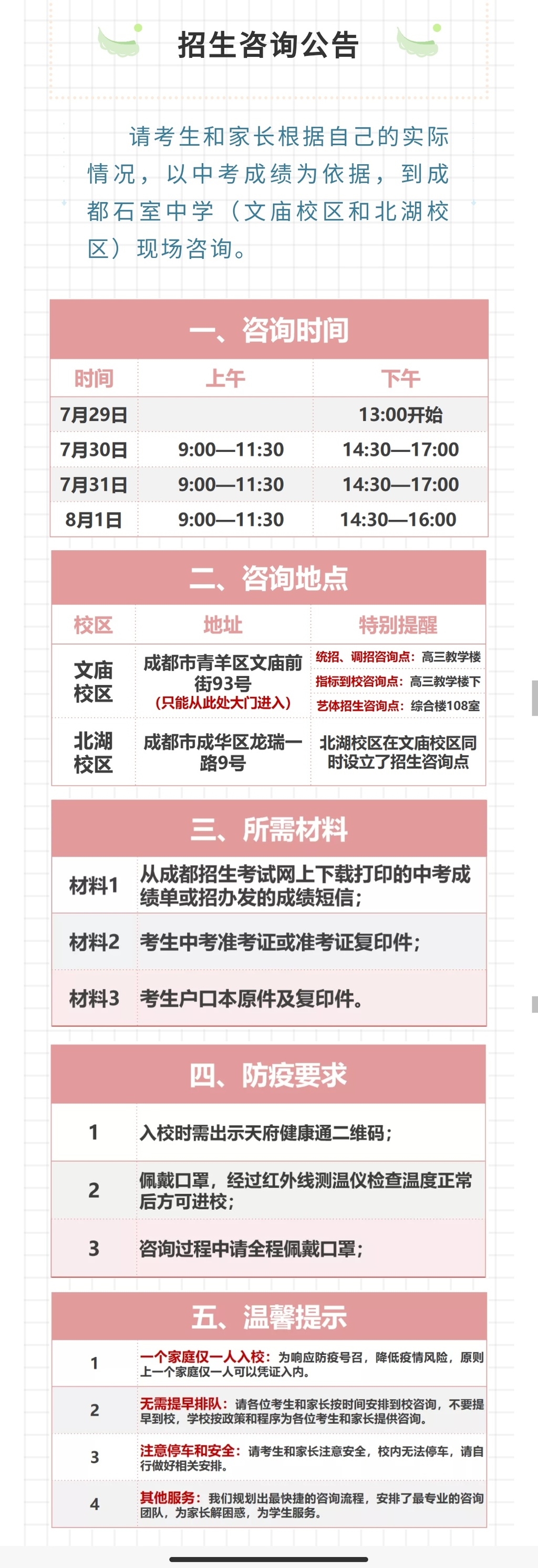 7月28日晚,成都市中考成绩分数段公布。记者从成都石室中学获悉,28日早些时候,成都石室中学获悉发布2020年中考招生咨询公告。公告详细说明了现场咨询时间、所需材料。与以往不同,本次咨询按照防疫要求,需要进行体温检测和全程佩戴口罩。