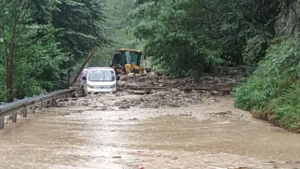 8月12日下午15时许,在绵阳北川羌族自治县墩青路船坪村段,一辆载有蔬菜的货车突遇泥石流,巨大的冲击力将车辆冲到路边紧靠防护栏,而防护栏外是高高的悬崖……