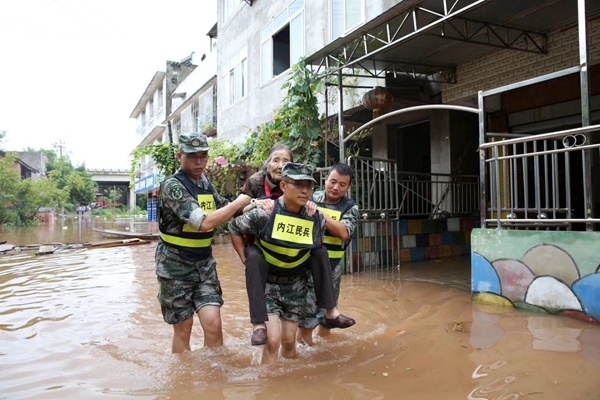 内江市东兴区椑木镇,民兵应急抢险分队队员正在转移受困群众。兰自涛摄
