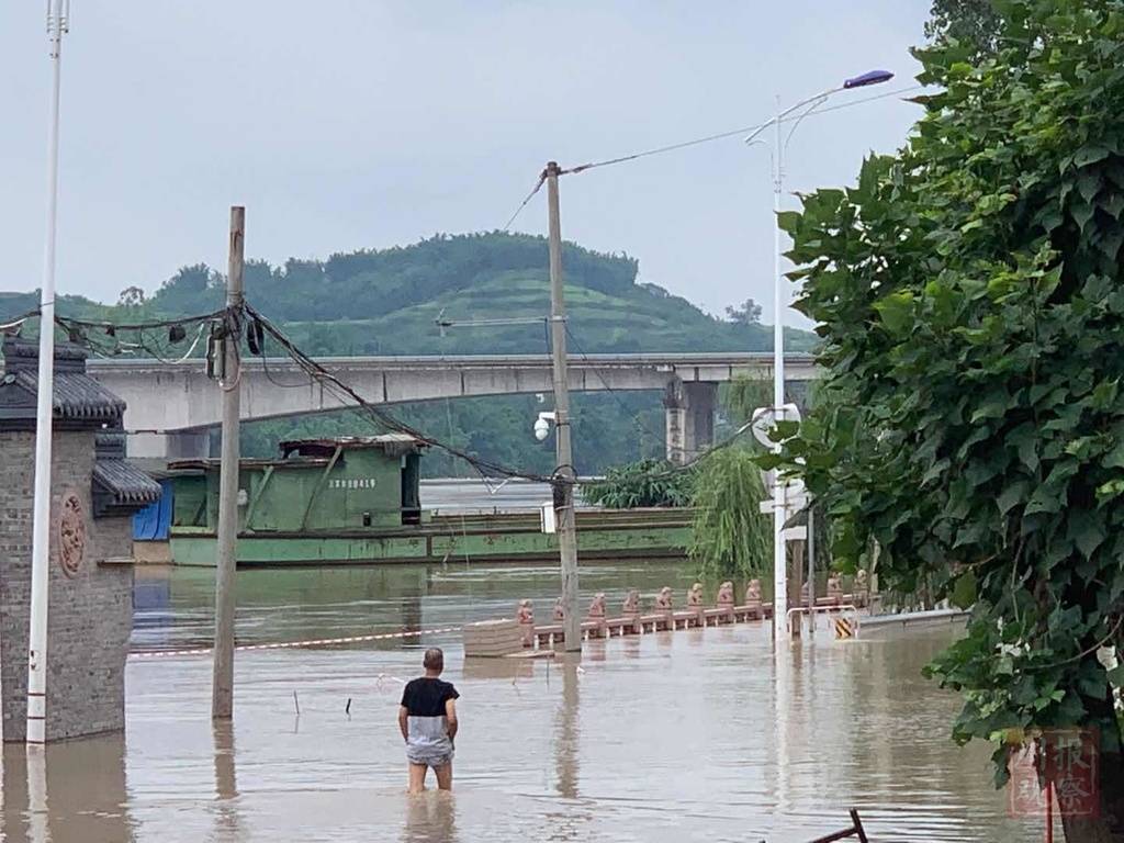 下午14时,川报观察记者在狮市镇看到,镇上街面有不少店面被淹,洪水还在上涨。古镇外滨江路上的凉亭、楼阁等,已全浸泡在水中,"亭亭”玉立,宛在水中央。