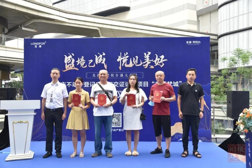 日前,记者从省自然资源厅获悉,成都市不动产登记“交房即领证”试点项目颁证仪式在龙湖梵城项目交房现场举行,315户业主在交房当天领取了不动产登记证书。