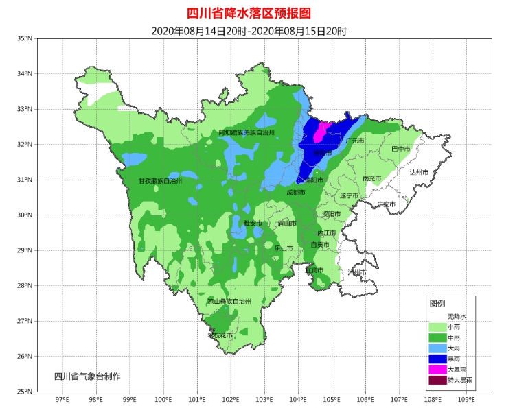 8月14日晚上到15日白天,广元、绵阳、德阳、成都、雅安、眉山、乐山7市和内江、自贡、宜宾3市西部阴天有中到大雨,其中广元、绵阳、德阳3市西部有大雨到暴雨,局部大暴雨,盆地其余各市阴天间多云有阵雨或小雨;川西高原和攀西地区阴天有小到中雨,局部大雨。