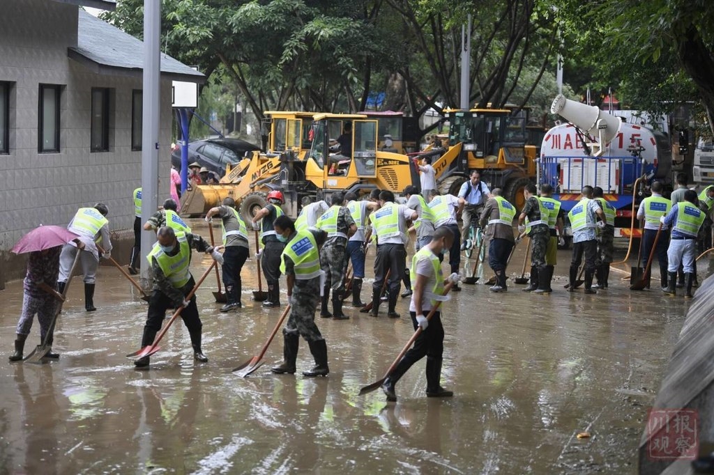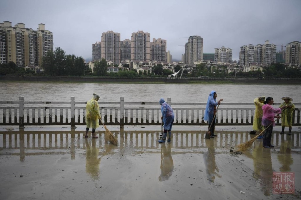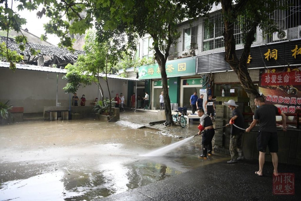 洪峰过境后,当地党员干部带领群众进行排涝清淤。被洪水“侵蚀”后的街道遍地淤泥,商铺也受损严重。一位正在打扫商铺进行生产自救的老板说道:“洪水过后,生活还要继续。”