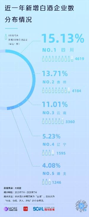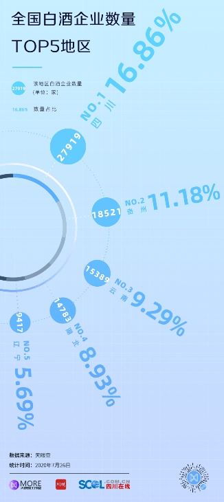 截至2020年7月26日,四川省白酒企业数量名列全国第一,近2.8万家。贵州省、云南省、湖北省和辽宁省分列第二至五位。四川白酒企业数量远超第二名贵州省,差值近万。