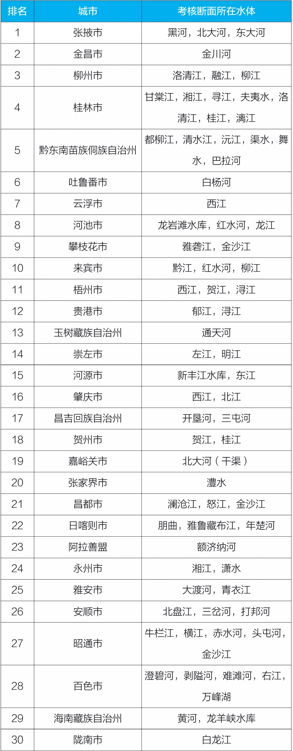 通报显示,1-7月,全国地级及以上城市中,张掖、金昌、柳州等30个城市国家地表水考核断面水环境质量相对较好(从第1名至第30名),铜川、沧州、邢台等30个城市国家地表水考核断面水环境质量相对较差(从倒数第1名至倒数第30名)。