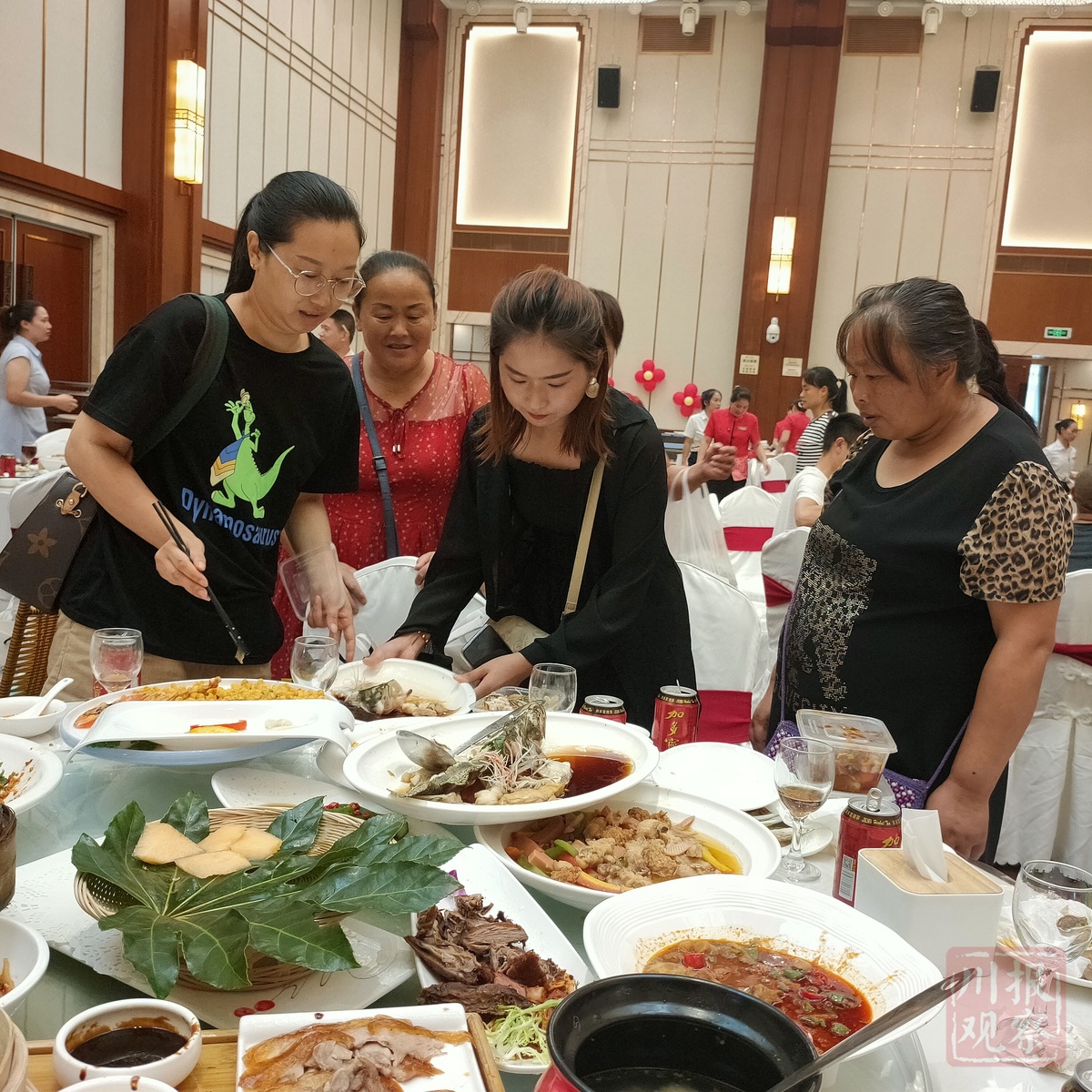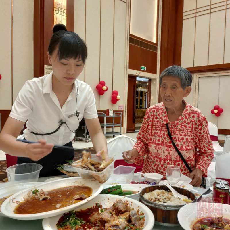 8月14日中午12点50分,在眉山开元禧悦酒店管理有限公司一大厅内,上10桌客人正在用餐。用餐快结束时,服务员主动走到桌前,劝导他们将剩余的菜打包回家。