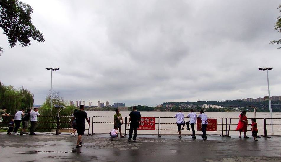 8月13日13:30,长江边上,市民倚着围栏看涨水。龙欣雨摄