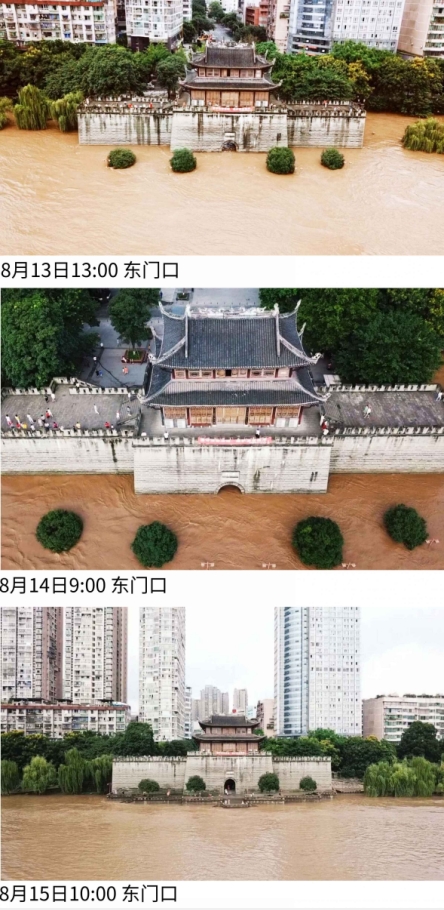 记者从8月13日中午至8月15日中午,记录了大量洪峰过境的画面。接下来,一起从两种视角,来看洪峰过境前后的变化吧。