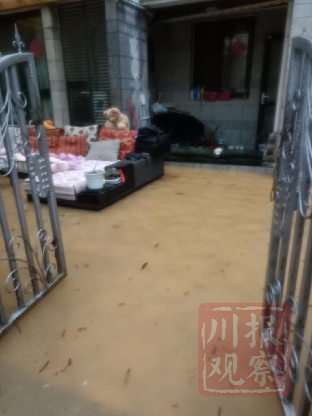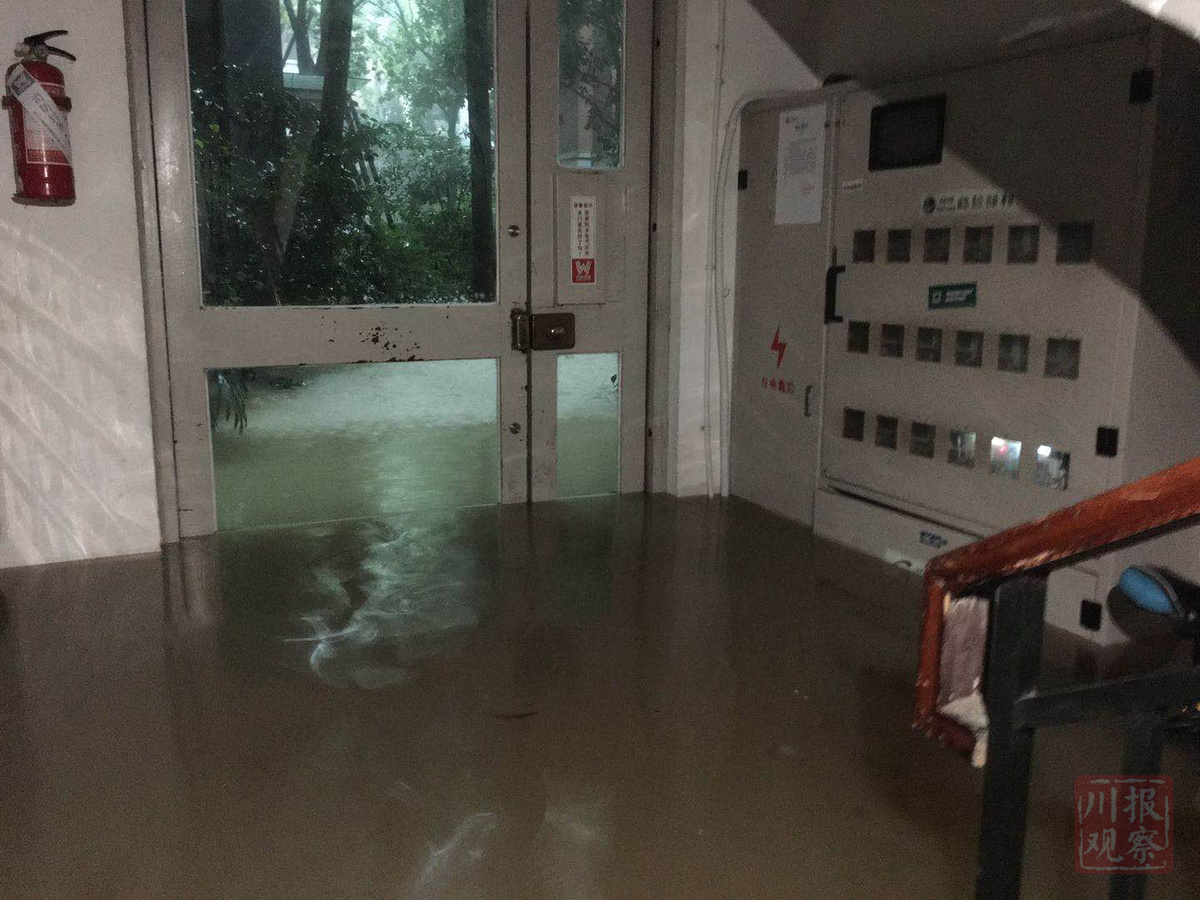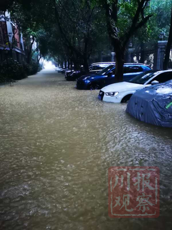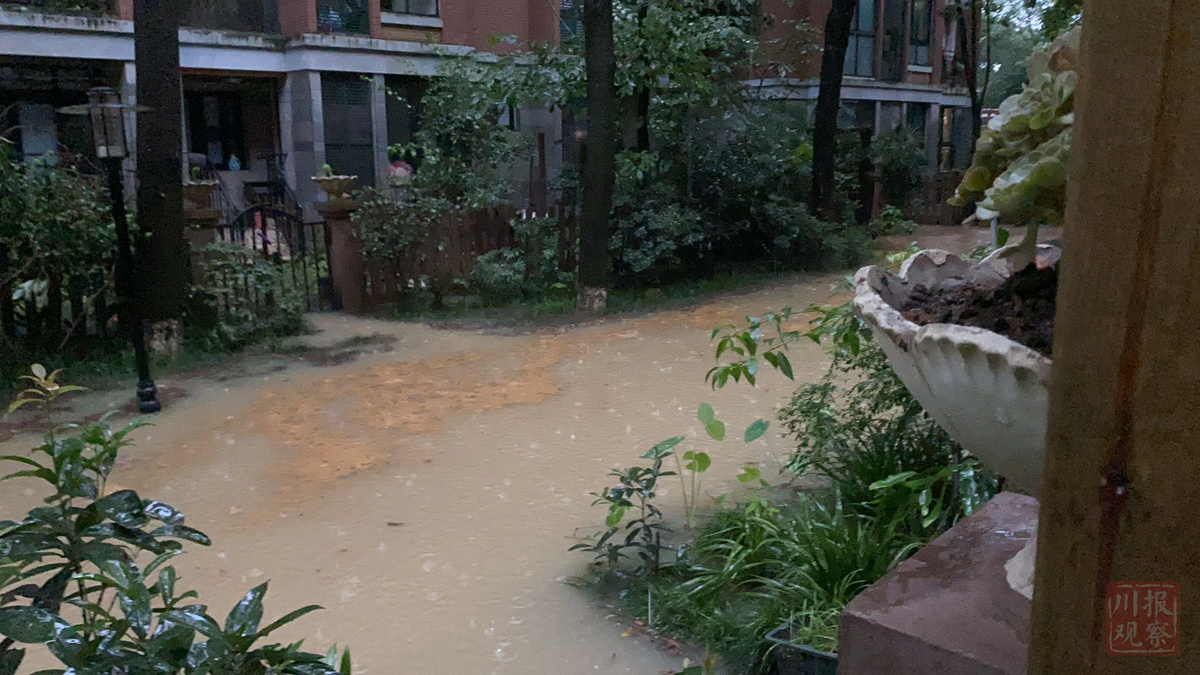 16日上午,成都市龙泉驿区持续暴雨,北泉路、桃都大道附近的几个十字路口,均有较深积水。