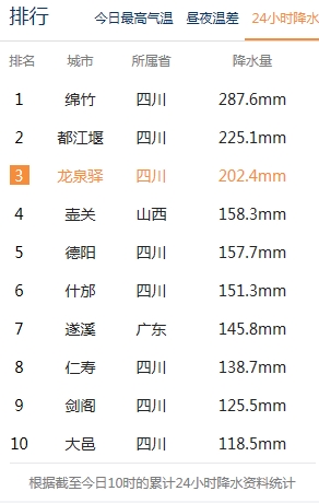8月15日夜间到16日早上的强降雨,使四川再度强势登陆全国降水排行榜。截至8月16日10时,全国降水排行榜上,四川绵竹、都江堰、龙泉驿、德阳、什邡、仁寿、剑阁、大邑8个国家气象站点凭借累计24小时降水量进入前十名。