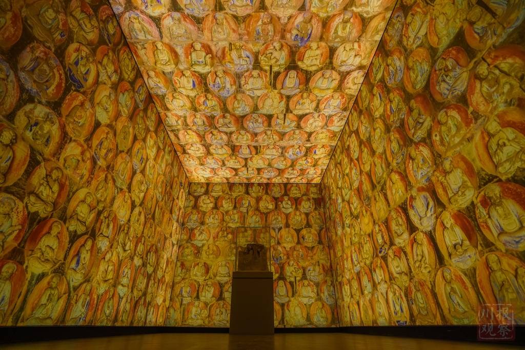 据介绍,为了弥补千手观音、圆觉洞等难以移动的大足石刻精华不能到馆的遗憾,展厅中使用了沉浸式灯箱造景、超300英寸的巨幅投影等展陈手段,带领观众身临其境地畅游大足石刻。