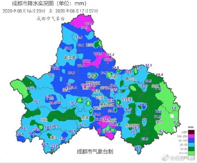 8月16日20时至17日7时,强降水集中出现在成都市中西部,最大降水量出现在天府新区永兴大树219.2毫米,各区(市)县最大雨量:温江永宁花篱154.3双流黄龙溪响水135.2彭州龙门山银厂沟130.9都江堰玉堂水泉102.7郫都唐元韭菜基地97崇州道明乌尤85.5高新区中和街道82.8东部新区养马尹家祠81.3新都清流78龙泉柏合红学75.2大邑鹤鸣63.9新津金华回龙60.6邛崃夹关龚店59.4青白江政府中路57蒲江鹤山六合53.4金堂官仓双新47.4。