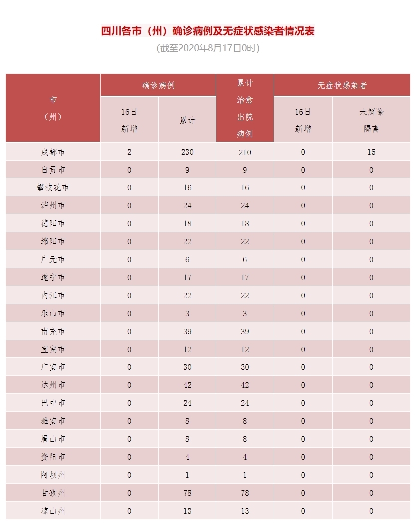 8月17日记者从省卫健委获悉,8月16日0-24时,四川新增新型冠状病毒肺炎确诊病例2例(均为境外输入,1例为8月14日自埃及乘机抵蓉,8月16日确诊;1例为8月13日印度尼西亚无症状感染者转确诊),无新增治愈出院病例,无新增疑似病例,无新增死亡病例。