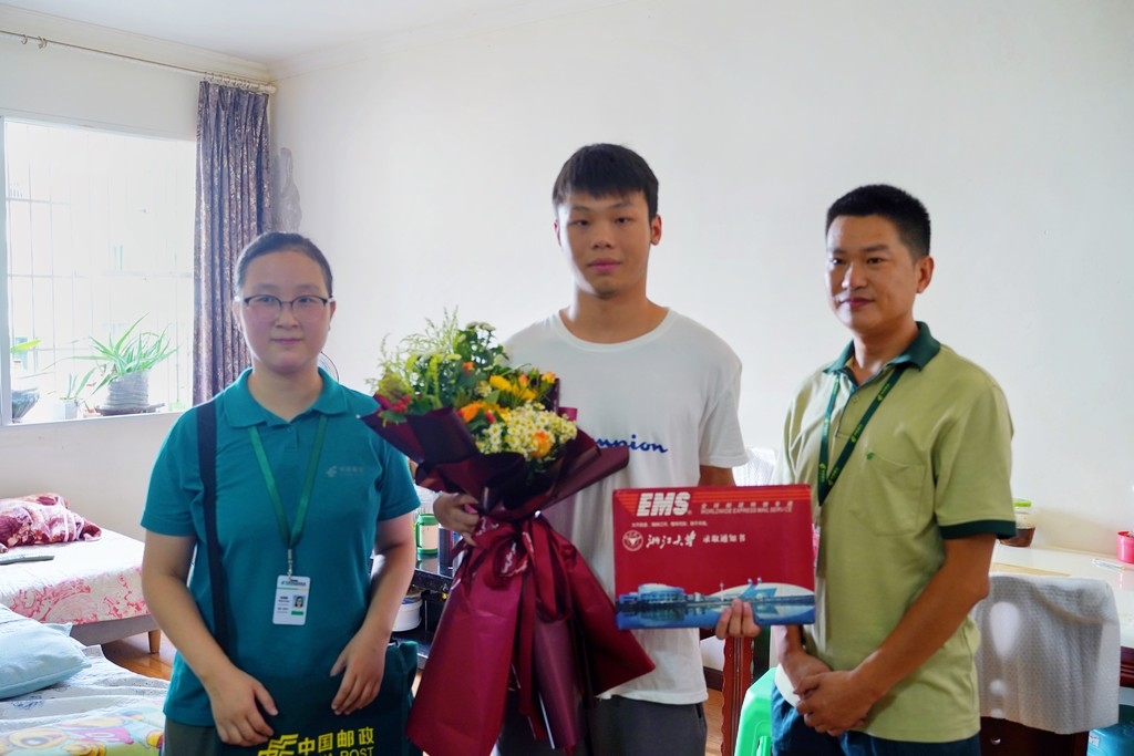 咚!咚!咚!8月17日上午9点10分,中国邮政广安分公司投递员张雪静带着今年广安高考第一封录取通知书敲响了广安友谊实验中学学生王若骅家门,大门打开后,张雪静将录取通知书递到了王若骅手中,这封录取通知书来自浙江大学。