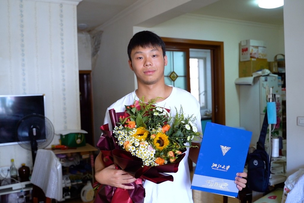 “我一直都想去浙大,这次终于是如愿以偿了。”虽然已经知道自己被浙江大学录取,但是收到录取通知书的王若骅还是难掩内心的激动,将手中的录取通知书看了又看。这封录取通知书是荣誉证书式的对开合页,蓝色封面上印着烫金立体压纹的“求是鹰”图案,以及浙江大学的中英文名称组合,中部是浙江大学的标志性建筑“求是大讲堂”图片,通知书的封底为浙江大学校训“求是创新”四个大字。