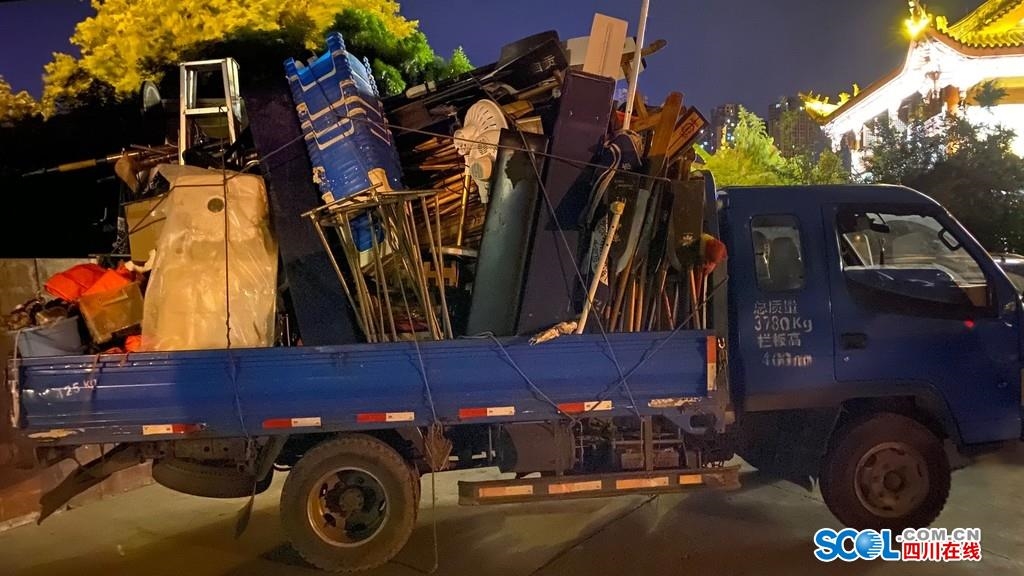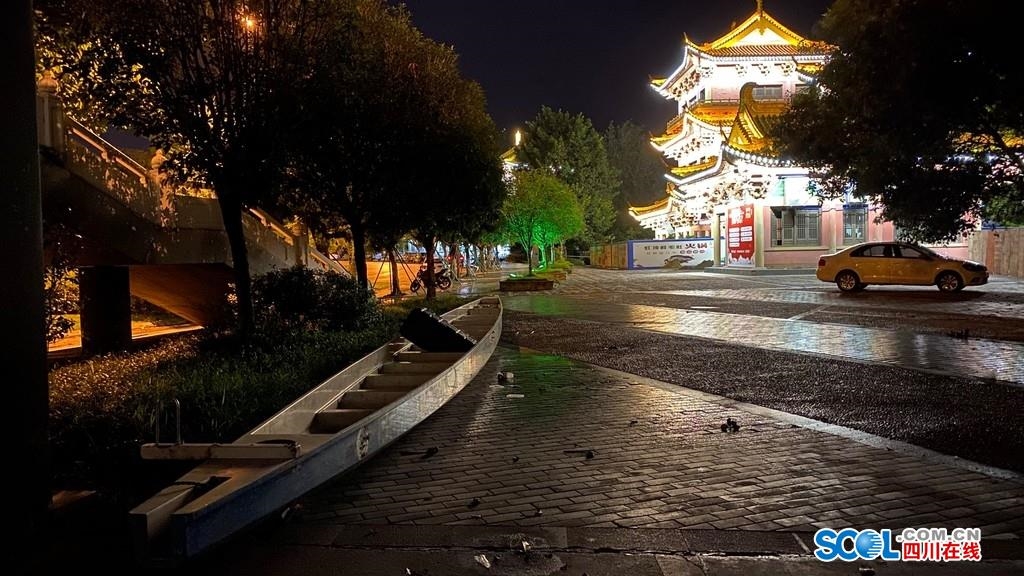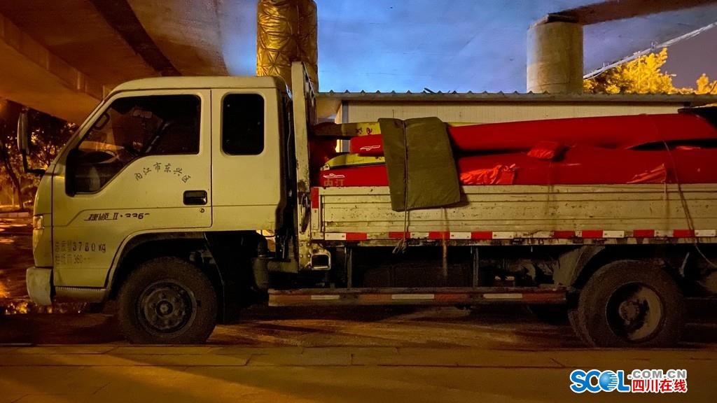 17日晚上23时48分,在内江市桐梓坝大桥下,内江市赛艇皮划艇队教练唐波一边焦虑地用手电筒查看被洪水淹没的训练基地和洪水水位,一边检查3辆大货车装的物品,这3辆大货车上,满满当当装着都是桨、力量器材等内江市赛艇皮划艇队的“全部家当”。