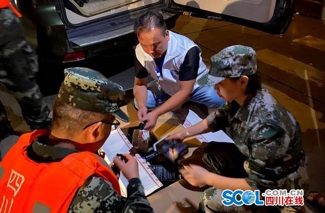 18日凌晨0点10分,内江市军粮供应和救灾物资储备中心副主任邓勇和内江市发改委副主任章艳秋等将50只强光手电筒送到正在内江市大洲广场执勤的武警手上。