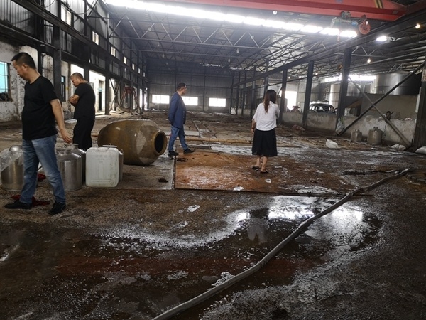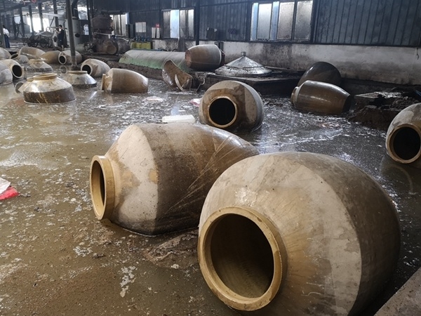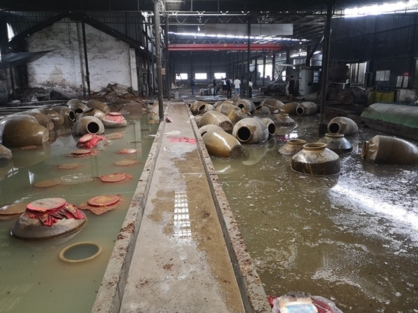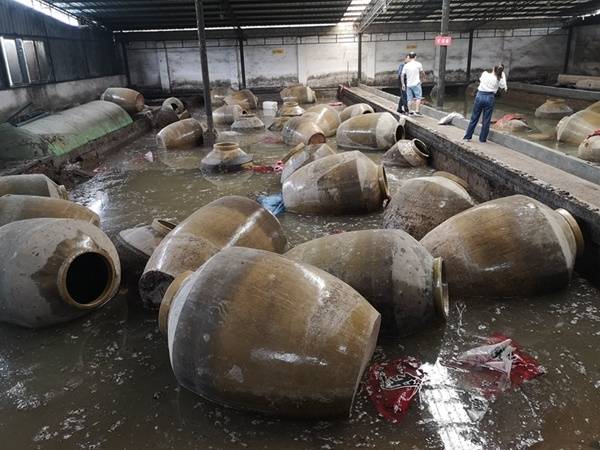 8月16日凌晨,四川德阳绵竹市普降大到暴雨,全市河水流量迅速上涨,险情时有发生。凌晨3点,暴涨的洪水涌进了绵竹富新镇的五福酒业,将上百个装上千斤窖藏基酒的巨型酒坛冲翻,损失惨痛。18日,记者在现场看到50个窖池被冲得满是泥泞,还有15个基酒原坛依然泡在水中。据统计,洪水冲毁了超过20万斤美酒,目前工人正在对受灾酿洒车间排水。