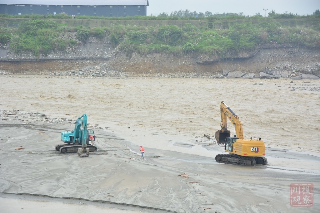 随后,现场又相继有1台挖掘机、3台铲车进入石亭江河道,准备疏浚河道调整流向,减缓河水对堤防垮塌处的冲刷。