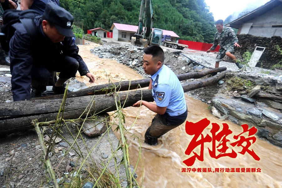 灾情发生后,宝兴县公安局硗碛派出所全体民警辅警联合硗碛乡开展抢险救援。“能走的村民跟着我们慢慢走,走不了的老人和孩子,原地不动等我们来背!”泥泞难行的村道上,救援队背起一个个老人和孩子,一步一步地往安全地带转移。泥巴裹满了裤腿,汗水湿透了衣襟,每一个脚步都坚如磐石,每一个微笑都曾温暖人心,您们是泥泞卫士,是夹金山脚的雄鹰!截至16日下午17时,共转移安置游客及群众300余人,受灾群众全部转移至安全位置。