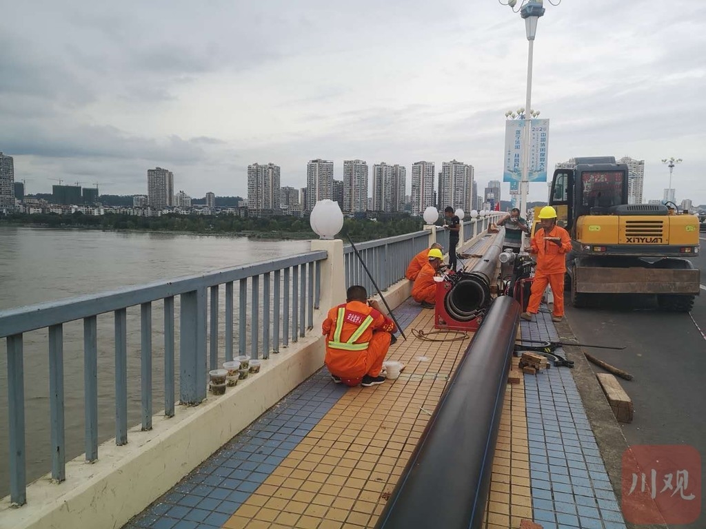 8月19日中午13时,记者在涪江三桥看到,多名工人们在桥梁人行道上,焊接供水管道。“从18日晚设备到场,已经连续作业17小时。” 现场工人汪强说。