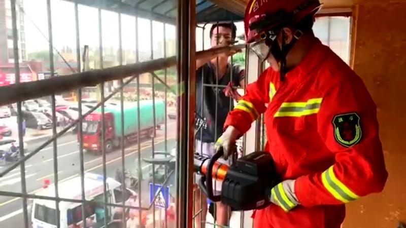 消防救援人员在征得小孩家长同意后,决定借助破拆工具组对一旁小孩家客厅窗户的防护栏进行破拆,以便尽快打通一条“生命通道”。与此同时,现场的公安民警积极组织楼下商铺的店主将停放在门口车辆挪开,为救援行动展开创造了有利条件。