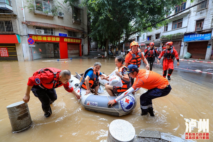 8月19日,长江、沱江洪峰抵达四川泸州交汇,泸州市红十字山地救援队、泸州市消防救援支队在城垣社区大河街居民楼疏散群众。