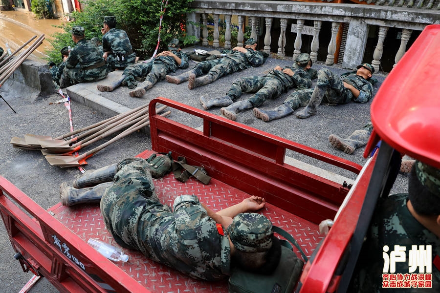 8月20日,清晨6时许,武警泸州支队官兵们在龙马潭区杜家街连夜奋战清淤作业后小憩。