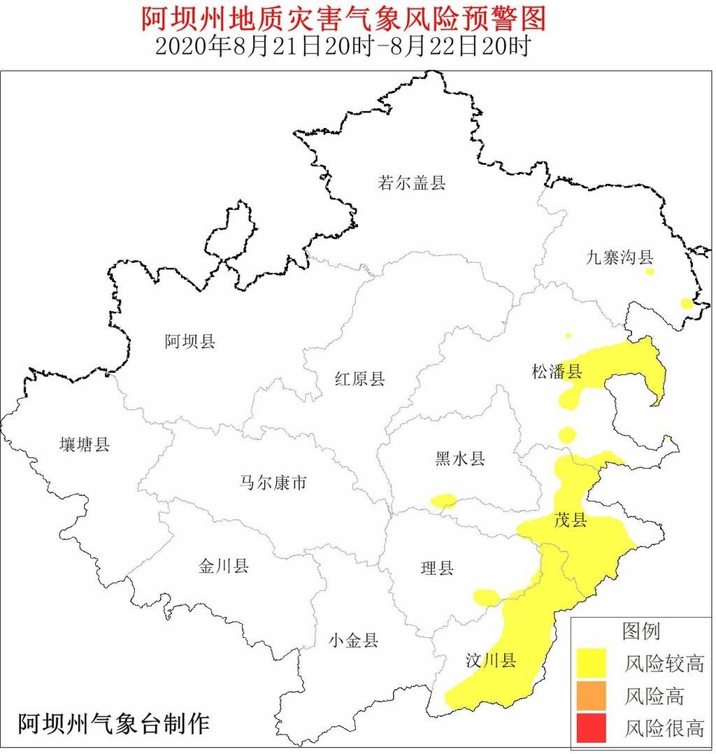 根据气象资料分析,8月21日20时-8月22日20时,汶川县、理县、茂县、松潘县、九寨沟县、黑水县等6县发生地质灾害气象风险等级较高,请注意预防。
