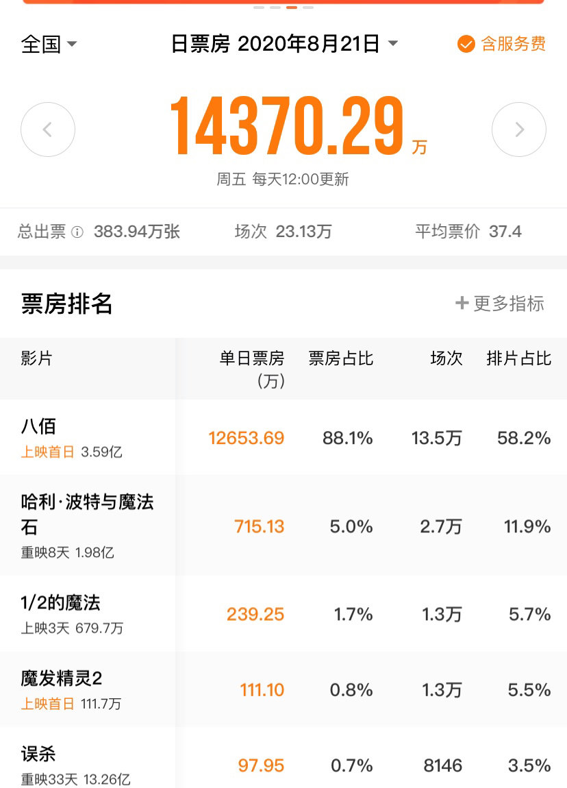 根据第三方监测平台灯塔专业版显示,8月21日,全国影院票房约1.43亿元,其中《八佰》为1.26亿元,占比88%。从14日开始电影,截至昨日,《八佰》累计票房接近4亿元。