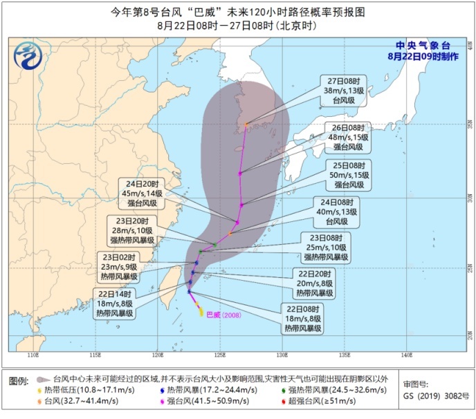今天9时,“巴威”距离日本冲绳县那霸市西偏南方向约610公里,中心附近最大风力8级。