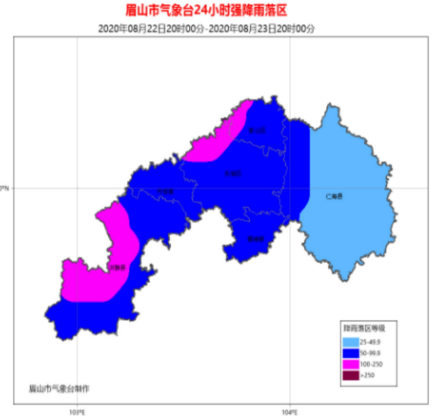 预计眉山市各区县8月22日晚上到23日白天有一次雷雨天气过程,雨量普遍为大雨到暴雨(40~60毫米),中西部个别地方有大暴雨(100~120毫米)。雷雨时伴有阵性大风,请注意防范雷电、大风等强对流天气带来的危害以及强降雨造成的城市内涝、中小河流洪涝和山洪地质灾害。