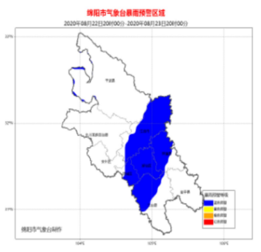 预计8月22日晚上到23日白天,绵阳市江油、梓潼、涪城、游仙、三台北部、平武南部、安州东部的部分地方有大雨到暴雨(40~70毫米)。请注意预防强降雨可能引发的山洪、泥石流、城市内涝等气象次生灾害的发生。