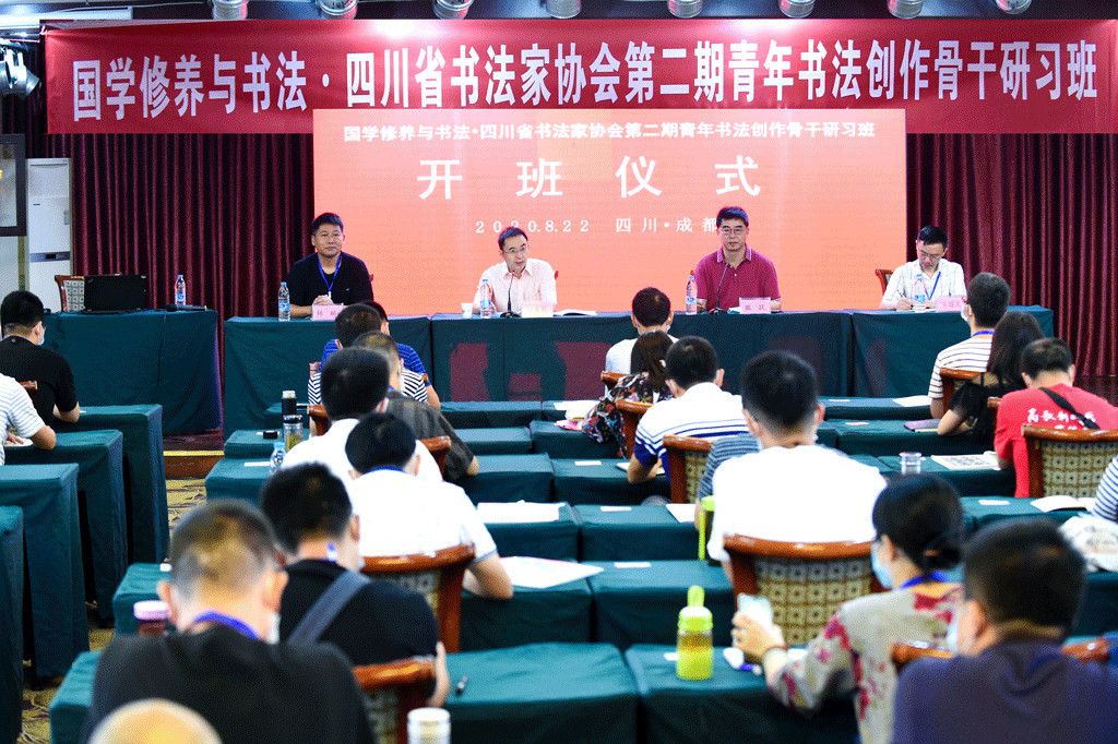 四川省文联党组成员、机关党委书记江永长出席开班仪式并讲话,中国书法家协会理事、四川省文联副主席、四川省书协主席戴跃,四川省书协副主席林峤、王道义,副秘书长唐昊、冷柏青、王书峰,四川省书协培训中心副主任、成都市书协副主席兼秘书长赵安如,四川省书协宣传工作委员会主任赵立、副主任何晓巍,四川省协行草专业委员会秘书长汤文俊,志愿者薛垲睿、颜振东、邓长春、魏佳等以及从全省各市州遴选出来的60名学员参加了简短的开班仪式。开班仪式由四川省书法家协会主席戴跃主持。