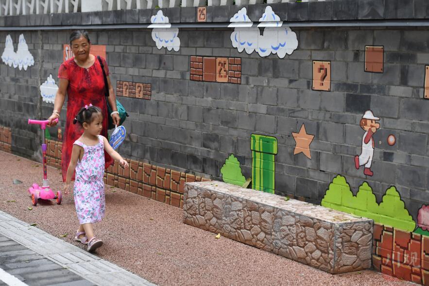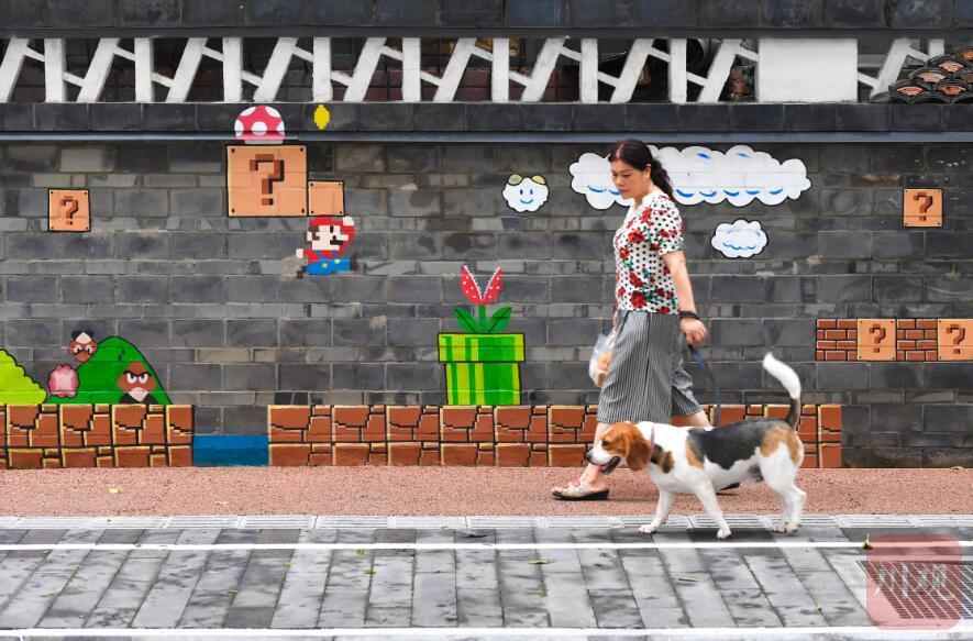 8月23日,成都市高新区白云街一侧的墙壁上,长达百余米的“超级玛丽”游戏彩绘墙体十分抢眼。