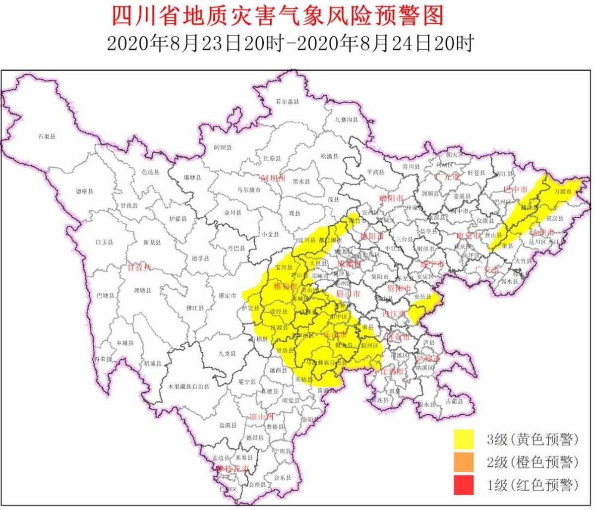 8月23日,省地质灾害指挥部办公室发布全省地质灾害气象风险预警。结合四川省气象台天气预报情况,8月22日20时~8月23日20时, 全省15个市州有黄色预警,其中雅安、乐山大部分地区进入预警范围。