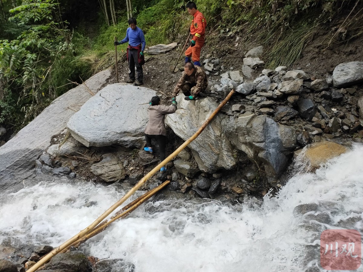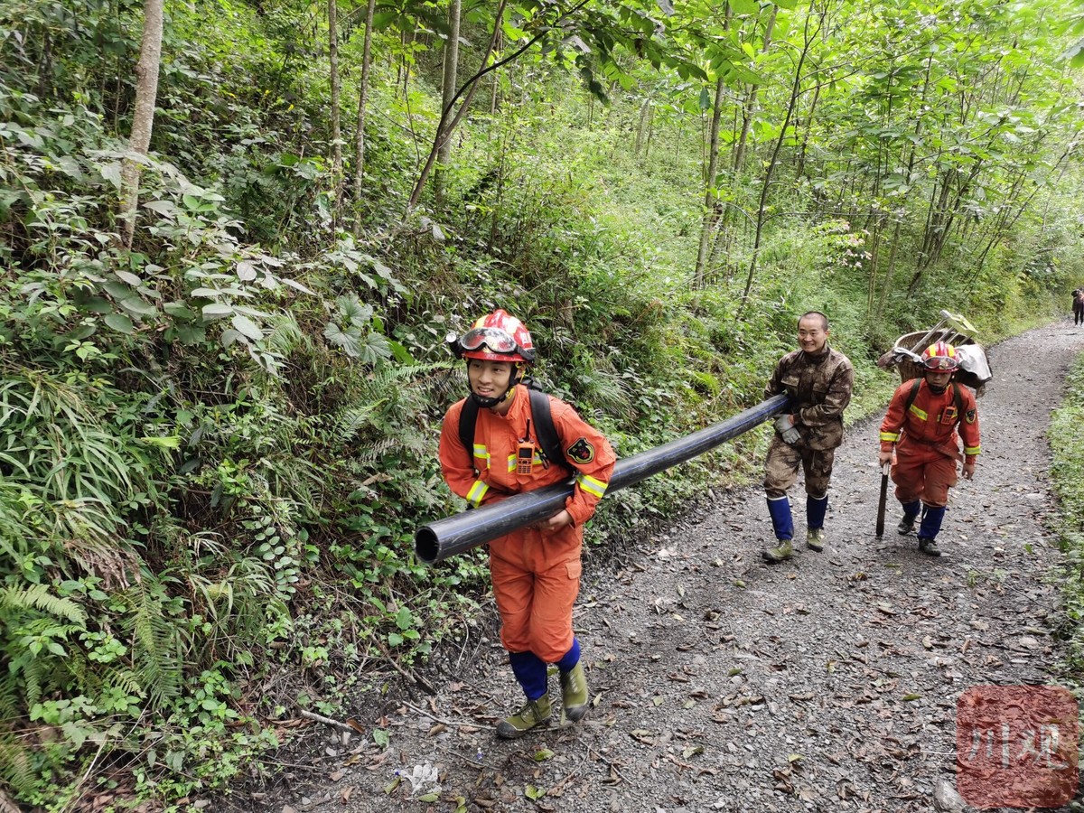 8月21日一大早,先期徒步进入片口的4名公安特警、2名消防队员和政府、村社干部,以及当地向导组成13人组成突击抢险救援队,到肩挑背驮沉重的设备跋涉到2000多米海拔的二道沟山梁中抢修水源。
