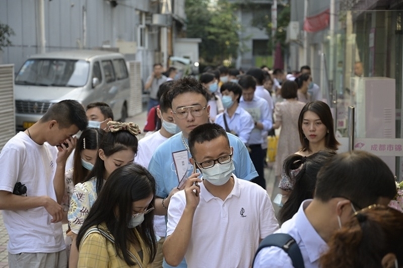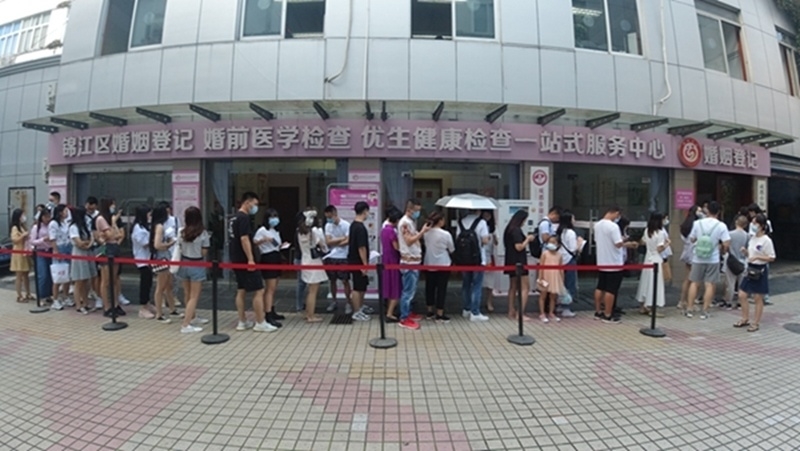 8月25日,是中国民间的传统节日七夕节。早上8点30分,清晨的阳光已撒满街道,天空一片蔚蓝,锦江区民政局婚姻登记处前排起了长队,不少准新人们选择在今天这个良辰吉日前来“扯证”,为结婚证上的日期赋予上浪漫又神圣的仪式感。