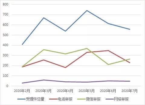 记者梳理发现,今年7月全省举报量整体呈下降趋势,在当月全省受理的举报件中,“12369”环境举报热线电话举报230件,微信举报265件,网络举报47件,其他渠道15件。其中,电话、网络举报量环比分别下降34.1个百分点和9.6个百分点,同比分别下降19.0个百分点和45.9个百分点,微信举报量环比上升42.1个百分点、同比下降10.7个百分点。