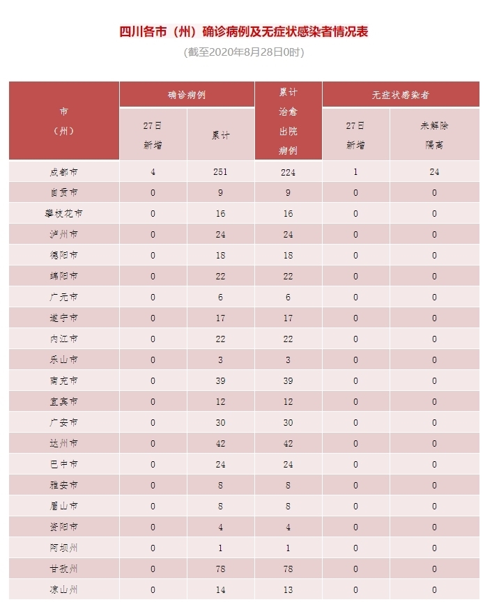 四川在线消息(记者 石小宏)8月28日记者从省卫健委获悉,8月27日0-24时,四川新增新型冠状病毒肺炎确诊病例4例(均为境外输入,1例为8月22日自伊拉克乘机经卡塔尔转机,8月23日抵蓉, 8月27日确诊;1例为8月24日自菲律宾乘机,8月26日抵蓉, 8月27日确诊; 2例为8月26日无症状感染者转确诊),新增治愈出院病例1例,无新增疑似病例,无新增死亡病例。
