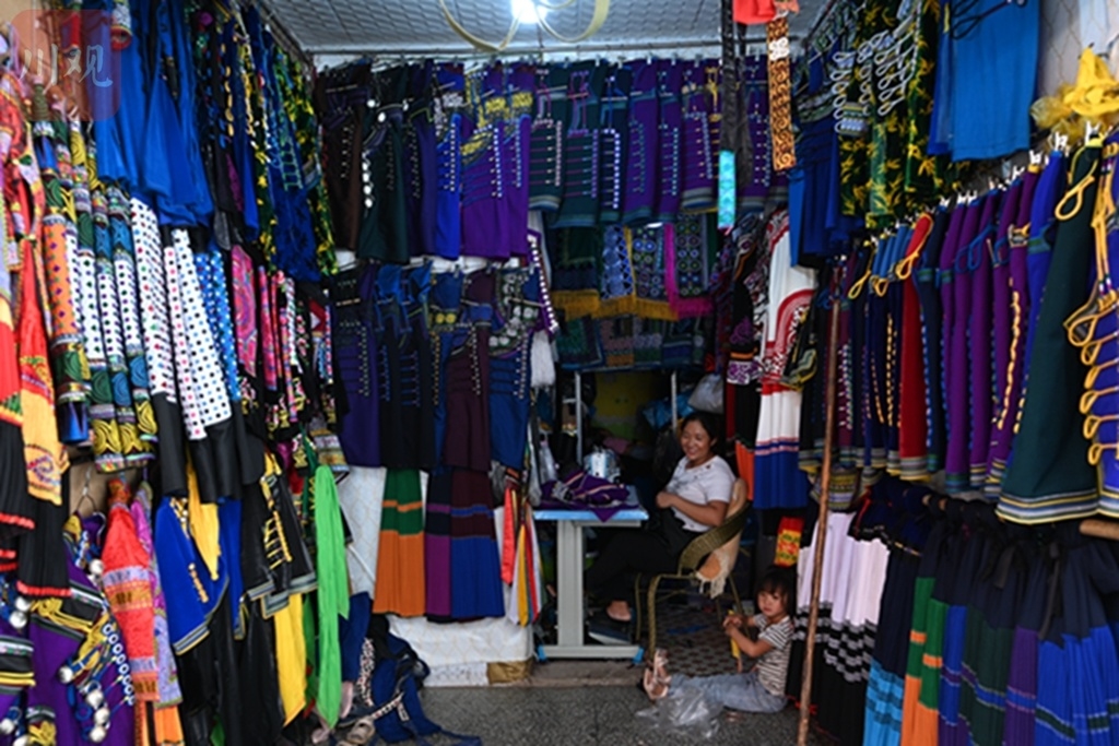 小街上一溜排开全是彝族服饰门店,这条长不过5、60米的服饰小街,最大特点是店面几乎都没招牌,所有店面都被各种靓丽的彝族服装包围,从服饰做工到设计的样式上或许是顾客进哪家店的选择。