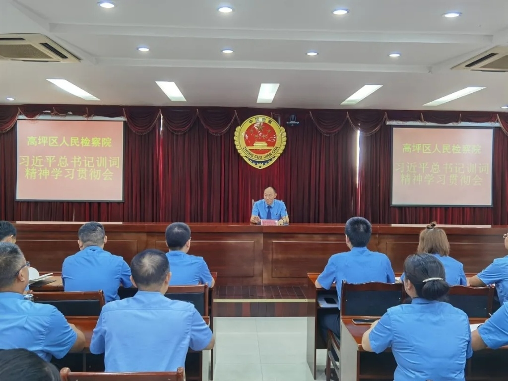 8月27日,南充市高坪区检察院召开会议,部署认真学习贯彻习近平总书记训词精神,要求把学习贯彻好习近平总书记训词精神作为当前和今后一个时期的重要政治任务,坚持不懈地用以武装头脑、指导实践、推动工作,通过党组中心组学习会、中层干部例会、全院干警大会等形式把全体干警的思想和行动统一到训词精神上来。