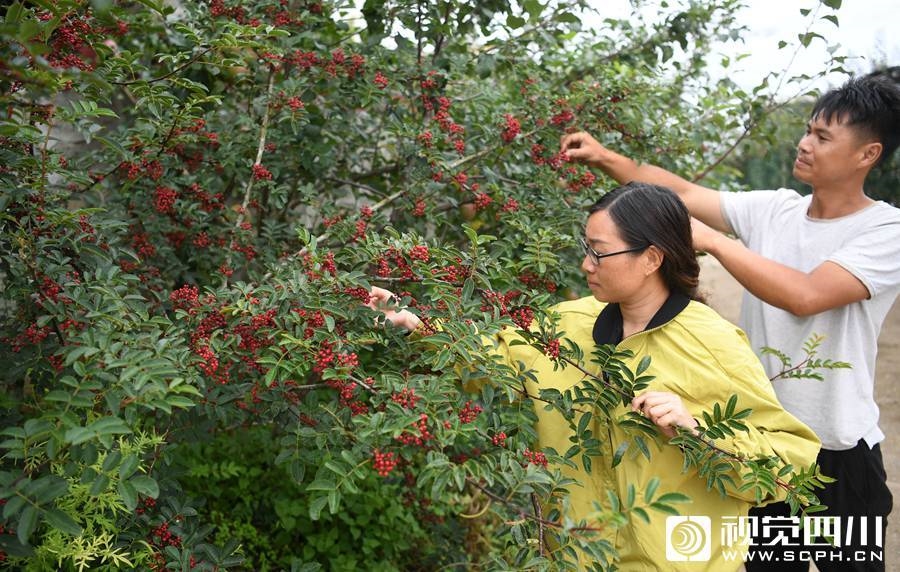8月16日,泸定县烹坝镇固包村位于大渡河上海拔2100米高的大山上。致富带头人、党员张雪峰正在田园采收红花椒、管理苹果。