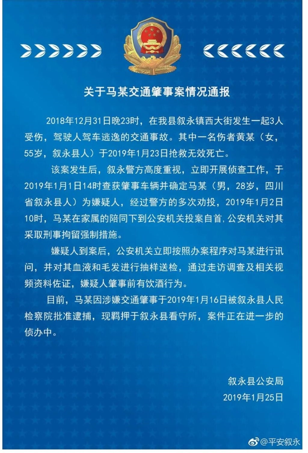 2019年1月24日,谭松韵经纪人发文透露谭母在跨年夜遭遇严重车祸,经治疗无效离世。随后警方通报,称司机马某肇事逃逸前有饮酒行为,目前因涉嫌交通肇事于2019年1月16日被批捕。